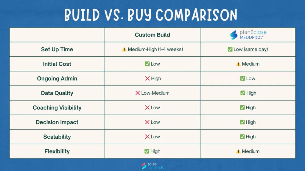 If your team is small, your admin is strong, and you simply need a structured view of qualification status, build it. If you need MEDDPICC® to produce data that managers can inspect, coach from, and trust in a forecast, then the tool-based approach gets you there faster and holds up better as you grow.