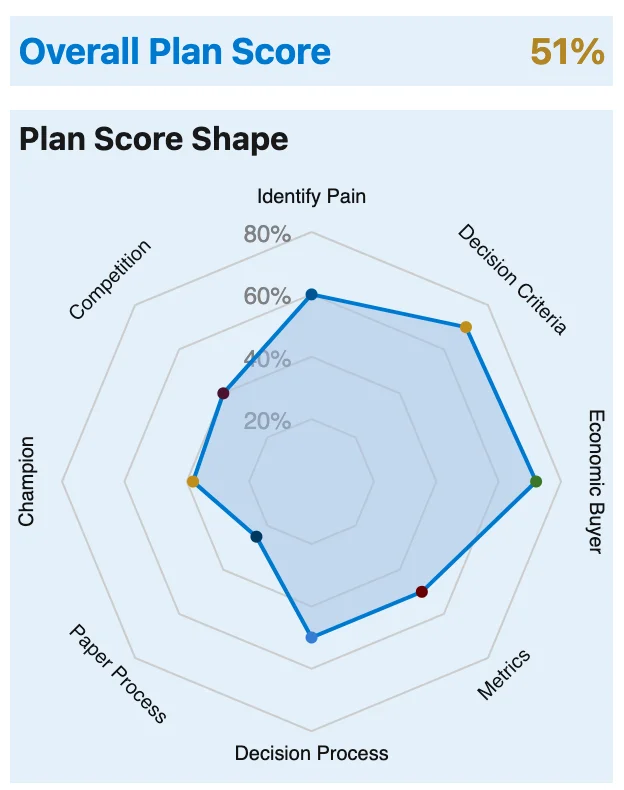 And once this is reportable across the pipeline, you can spot patterns. Are deals sitting in late stage with low plan scores? Are teams consistently skip Paper Process? Is there a part of Decision Criteria that is always unclear?