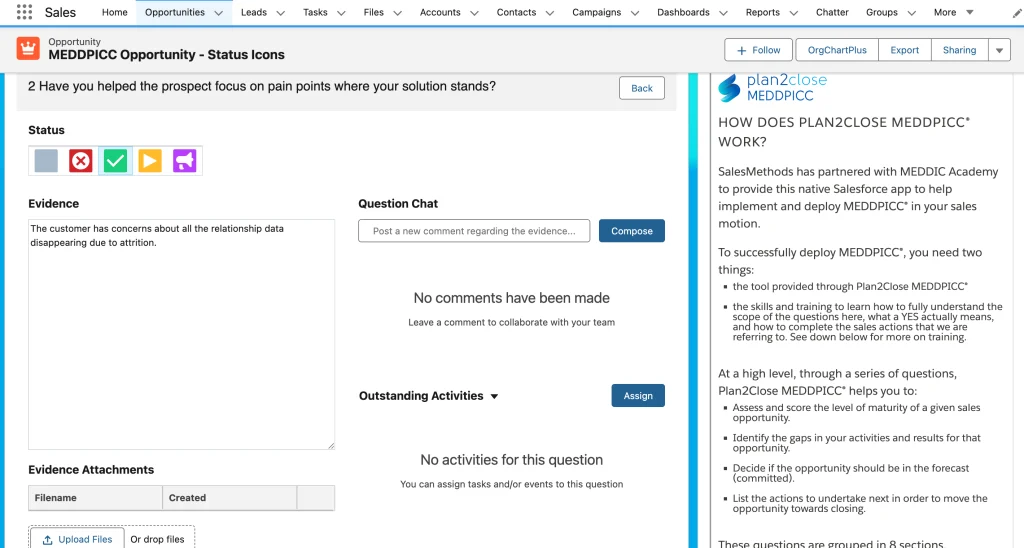 To change the question status, the salesperson will need to add evidence. In a manual build, this evidence usually ends up as optional notes that aren’t reviewed, compared, or tied to decisions. In Plan2Close, evidence is required in context, reviewed by managers on the record, and therefore directly influences progress and scoring, which makes it part of qualification and coaching, instead of text stored in a field.
